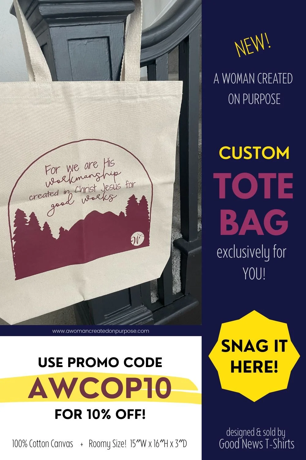 Sister, I’d be remiss if I didn’t share what Good News T-Shirts is doing for YOU, as a A Woman Created On Purpose reader. Because of their commitment to help us put forth the Word of God everywhere we go, they have created a CUSTOM “A Woman Created on Purpose” Tote Bag! This bag shares Ephesians 2:10– one of my favorite verses in the Bible, and the verse behind the name of this blog. You and I were created on purpose, and we can be reminded of that daily (and remind others) as we carry this tote.