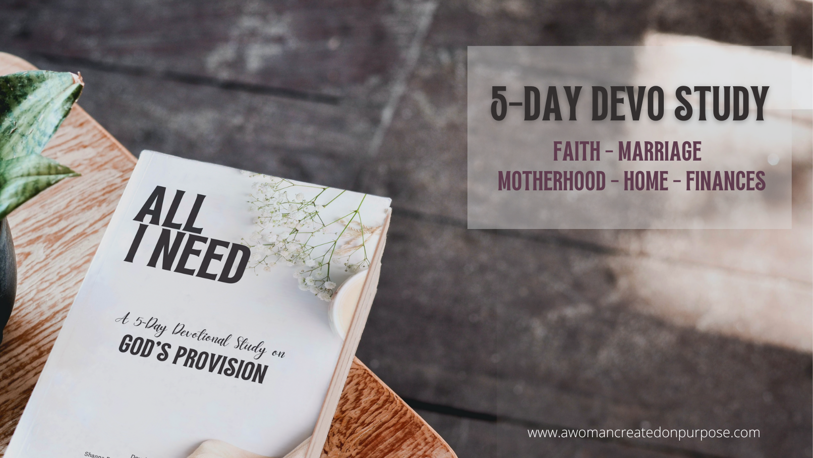 God provides all we need- He is the ultimate worker of good works in our lives! Do you remember the things He’s done? Do you see what He’s doing now? This 5-day devotional study focuses on the areas of Faith, Marriage, Motherhood, Home, and Finances. Through a mixed devotional-and-Bible-study format, you’ll be invited to take an honest look at your life.